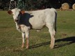 Here's a beautiful red roan heifer from a mating of our herd sire (92.25" TTT) and a large framed and heavy horned dam with a ton of total horn. She gives us the largest and most correct calf every season