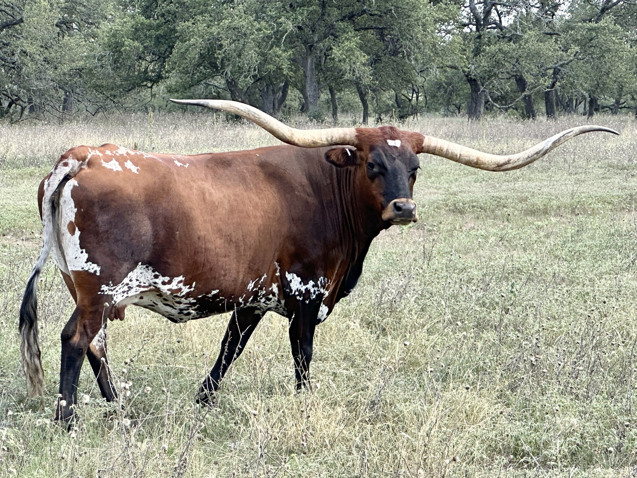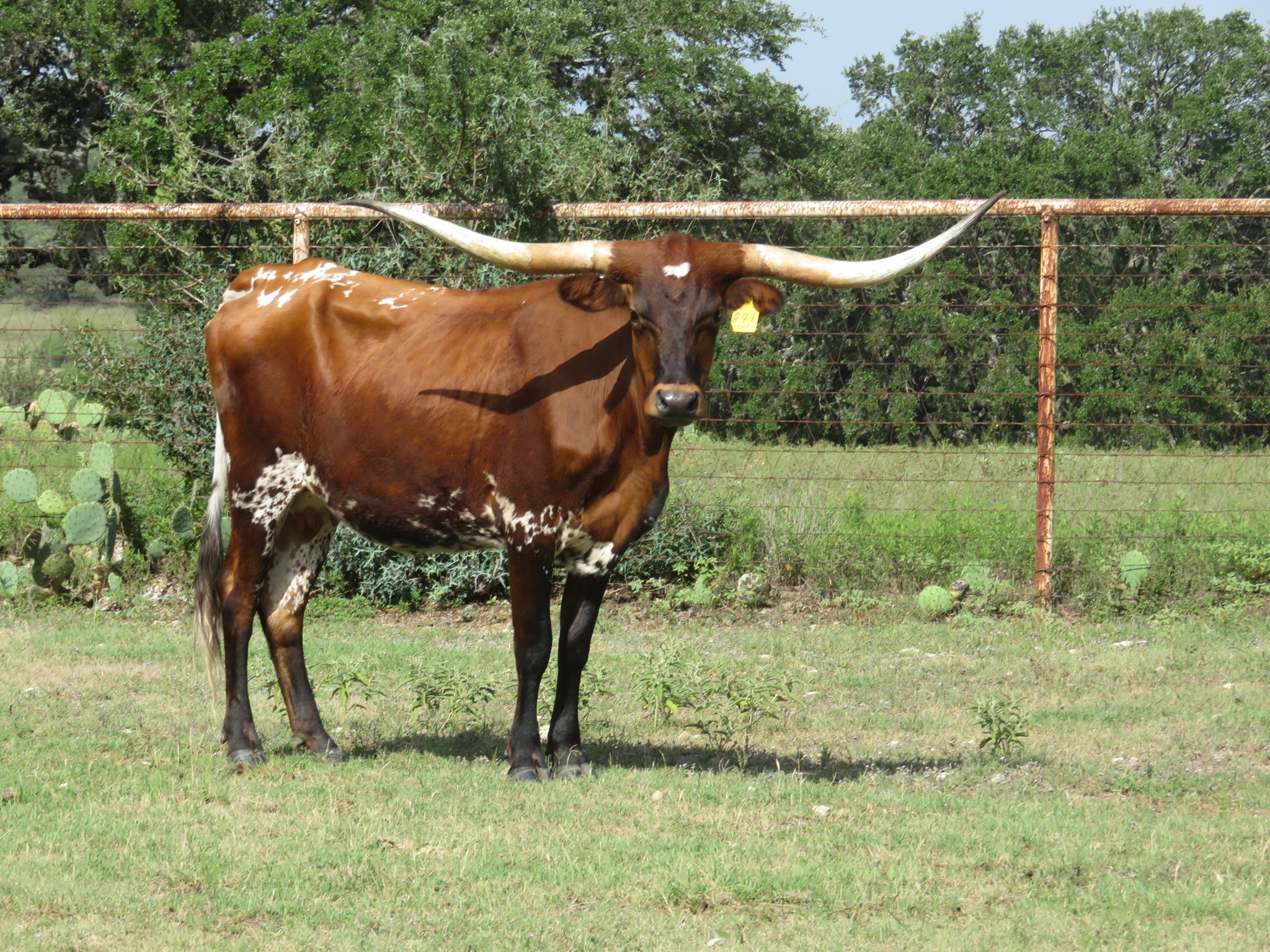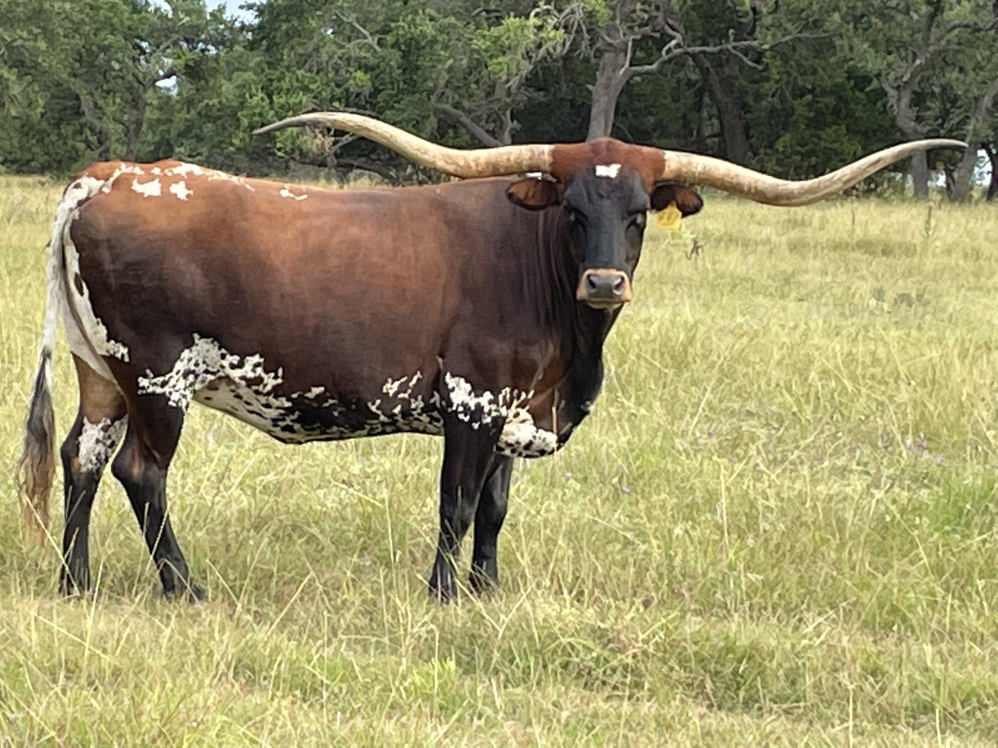 a triple twist massive horned cow with beautiful color and a big body. great mama