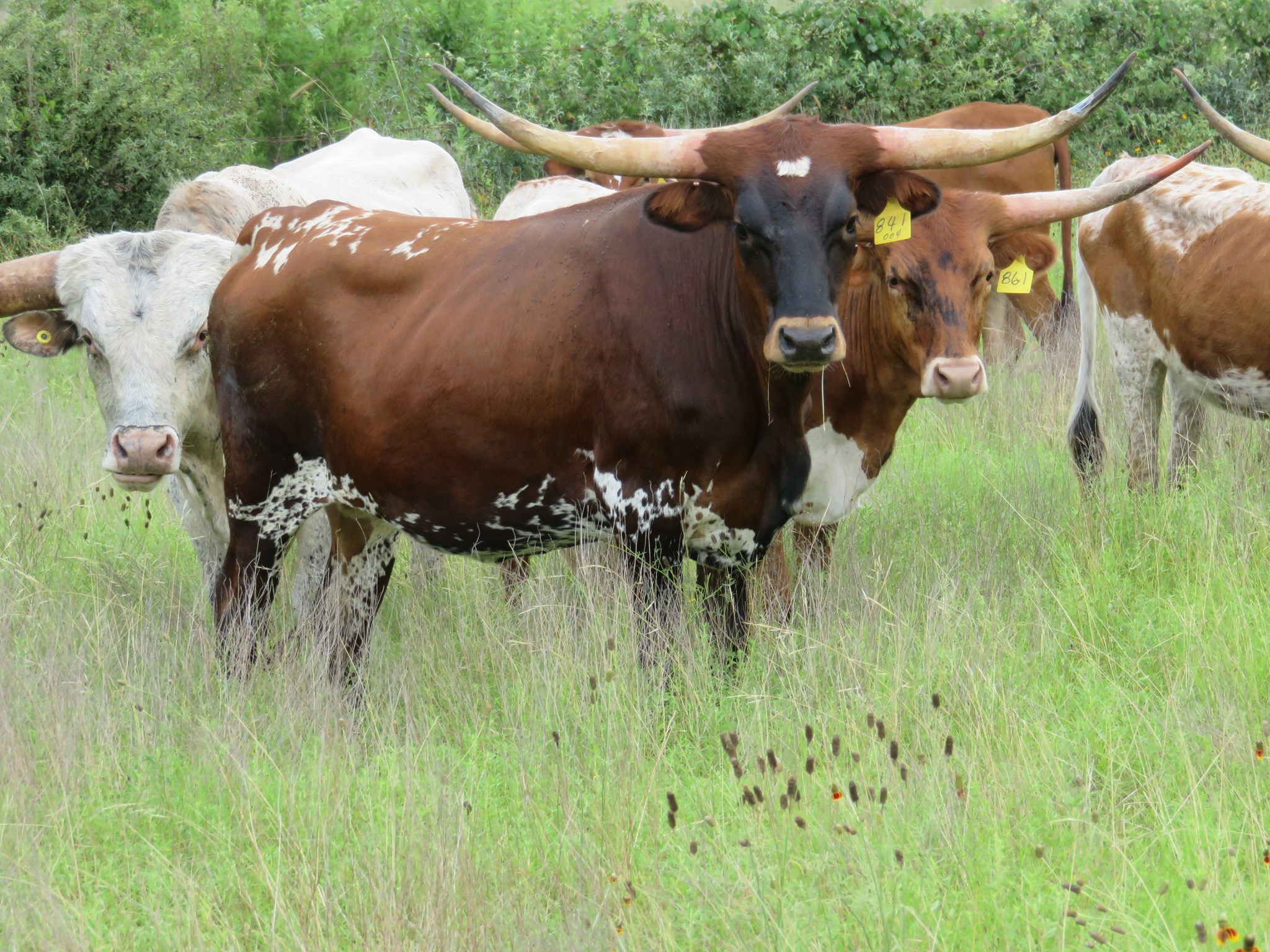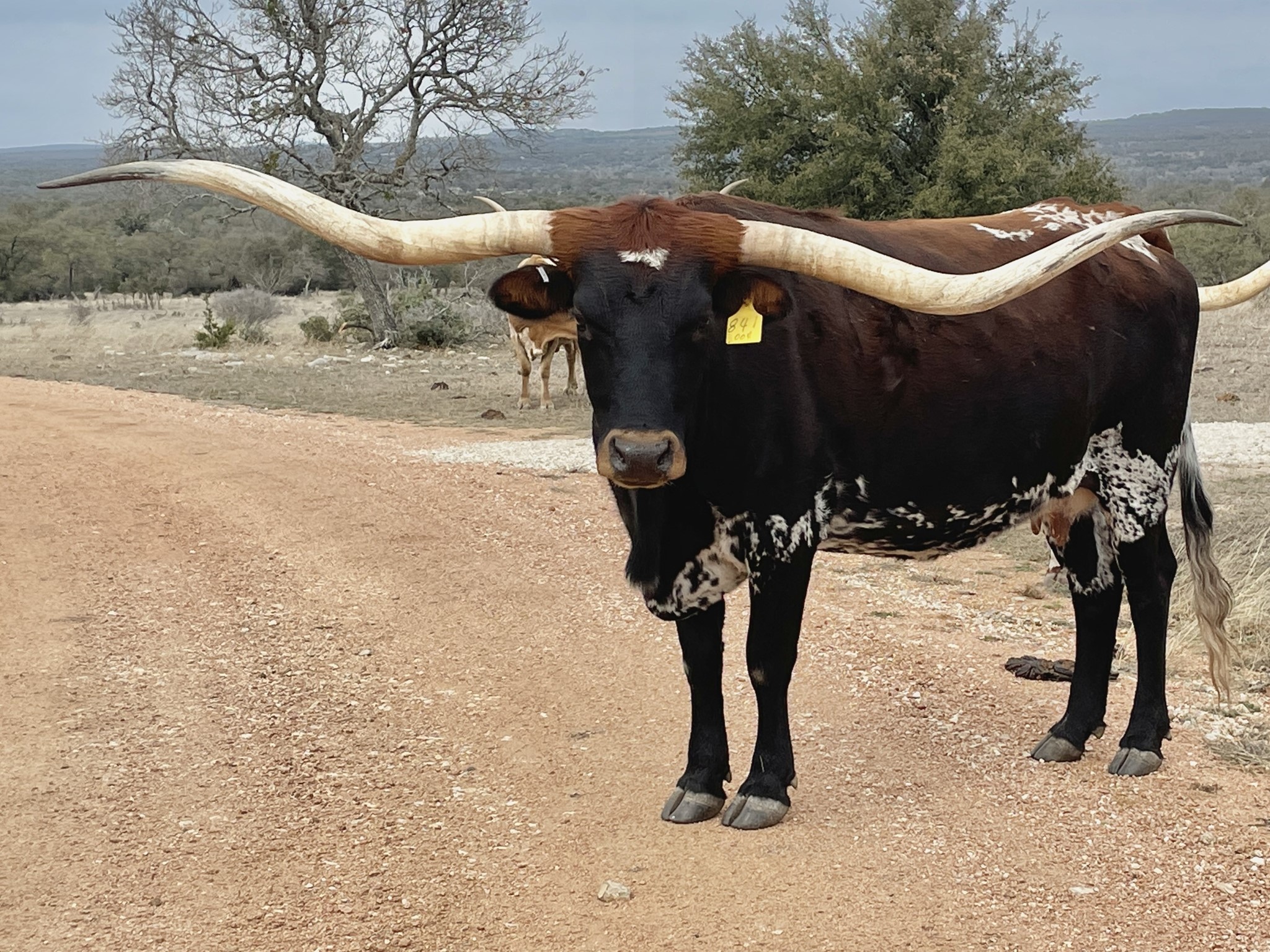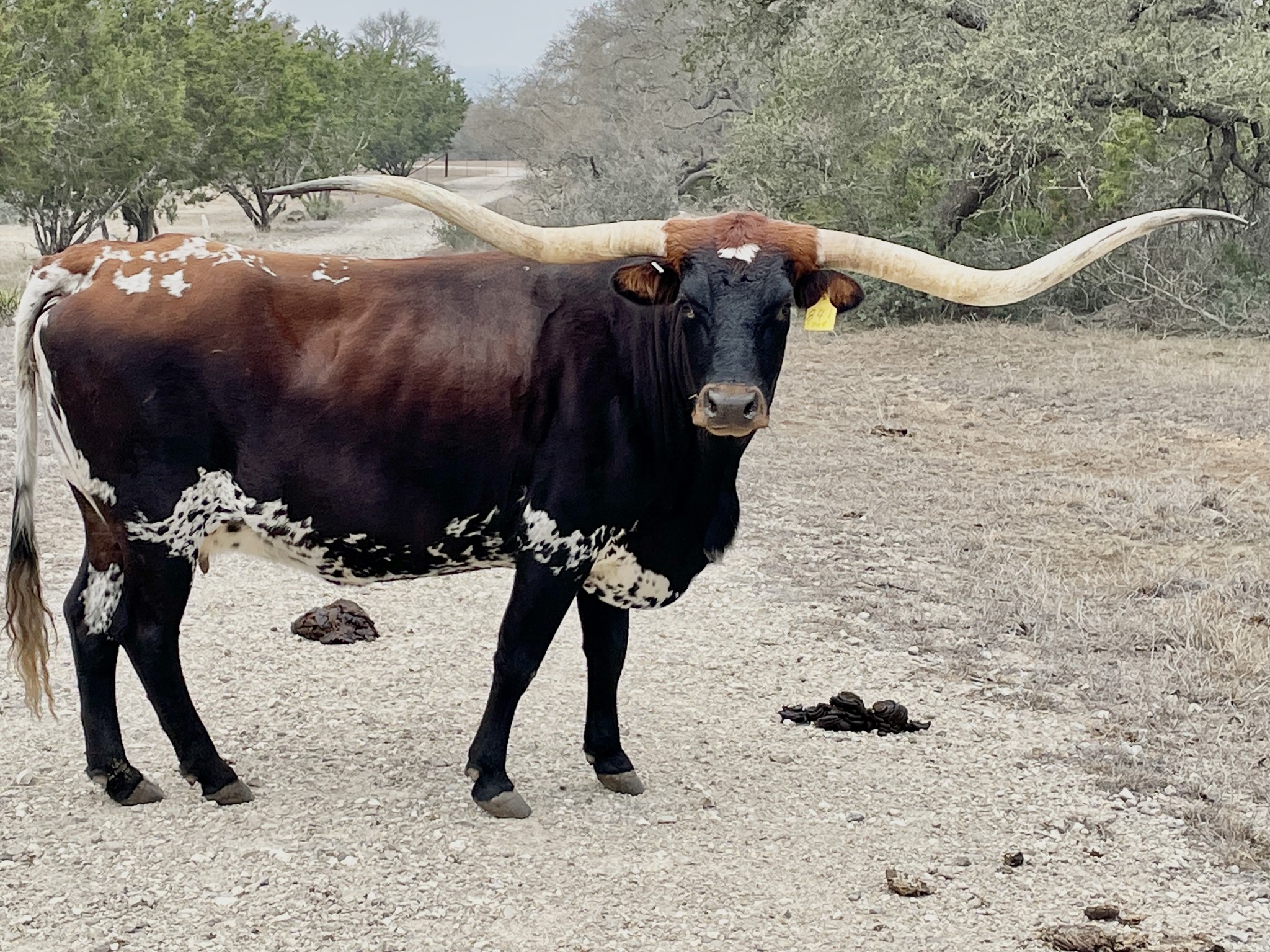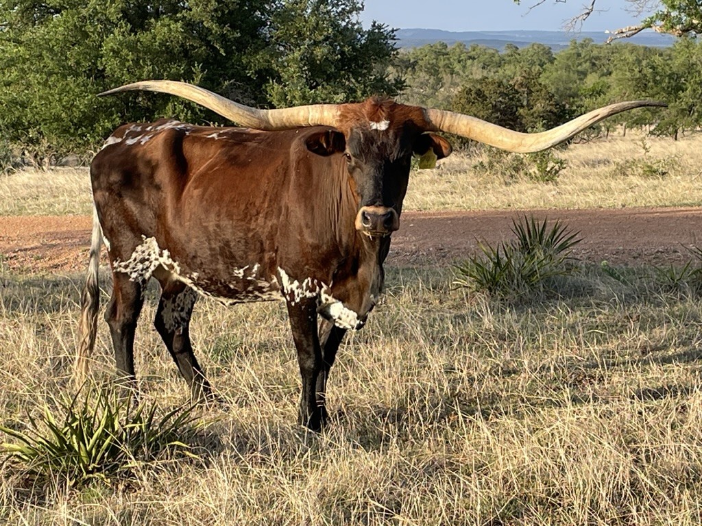 a triple twist massive horned cow with beautiful color and a big body. great mama